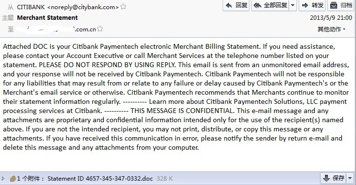 Email原文以美国花旗银行的账户为源,并欺骗附件是花旗银行的电子商户的帐单
