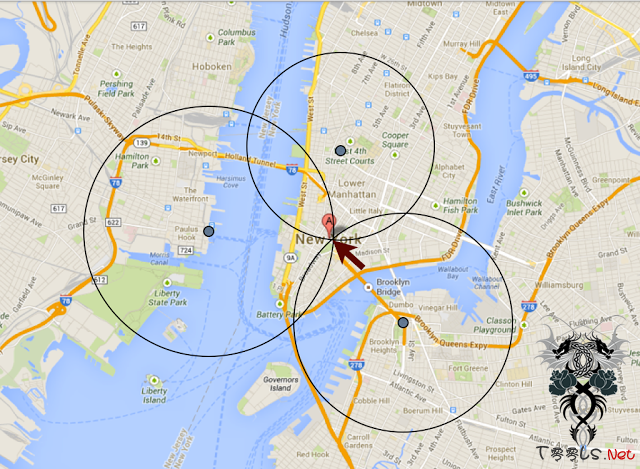 利用三个位置的距离信息就可以定位到该用户的准确位置,其原理与GPS定位是一样的。