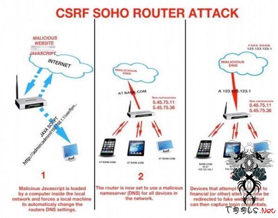 与传统的黑客行为有所不同,这次黑客的攻击目标并非计算机,而是路由器(包括无线路由器)。在长期的黑客攻防战中,我们的计算机已经几乎是一台武装到牙齿的设备,想要发动有效攻击是极其困难的。相反,作为网络出口的路由器设备不但要处理大量数据,而且几乎没什么有效的安全防护手段,不难看出这样的设备将会成为未来黑客研究的重点。根据图示,在具体的攻击行为方面,首先黑客要引诱用户通过浏览器访问特定的页面,下载恶意代码到本地,恶意代码会获取root权限并且自动修改DNS地址,这样攻击就在神不知鬼不觉的情况下完成了。