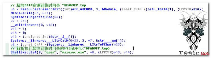 3)、释放资源中包含的MSI程序包(模块C)到临时目录(~DFAN9FP.tmp),调用msiexec.exe以静默参数解析安装。