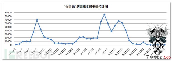 (2)、后续渗透得到部分病毒后台服务器的管理权限,通过进一步分析,掌握了“食鼠猫”病毒样本传播的历史统计数据以及病毒作者的其他信息。从“食鼠猫”病毒的后台安装统计数据中可以看出,本次新变种的传播感染量较高,在8月8日前后达到日感染量近9万最高峰,在总共一个半月的时间里,累计感染量达到95万。