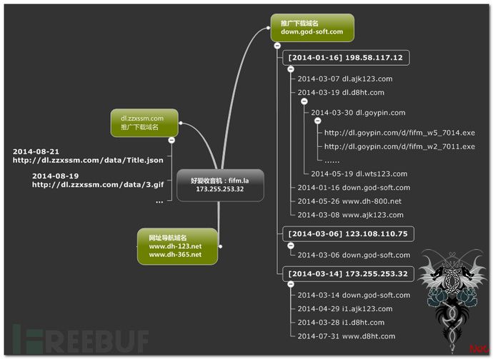 1)、通过对病毒关联域名的历史解析数据分析,可以此流氓软件的推广从2014年初开始,变种文件最少在30个以上,本次新变种从2014年8月份左右开始传播,大多通过诱导站点的流氓软件捆绑传播,涉及到的推广渠道多达数十个。本次变种使用的推广域名与服务器在编写分析报告时已经关闭,病毒作者可能更换了新的下载域名和渠道,后续传播情况有待进一步的监控。