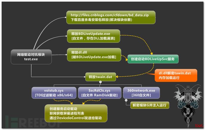 1)、下载百度杀毒软件压缩包释放,释放资源文件BDLiveUpdate.exe、dl.dll以及twain.dat,创建服务启动BDLiveUpdate.exe进程,在被白进程主动加载的dl.dll中解密twain.dat模块,然后内存加载运行。
