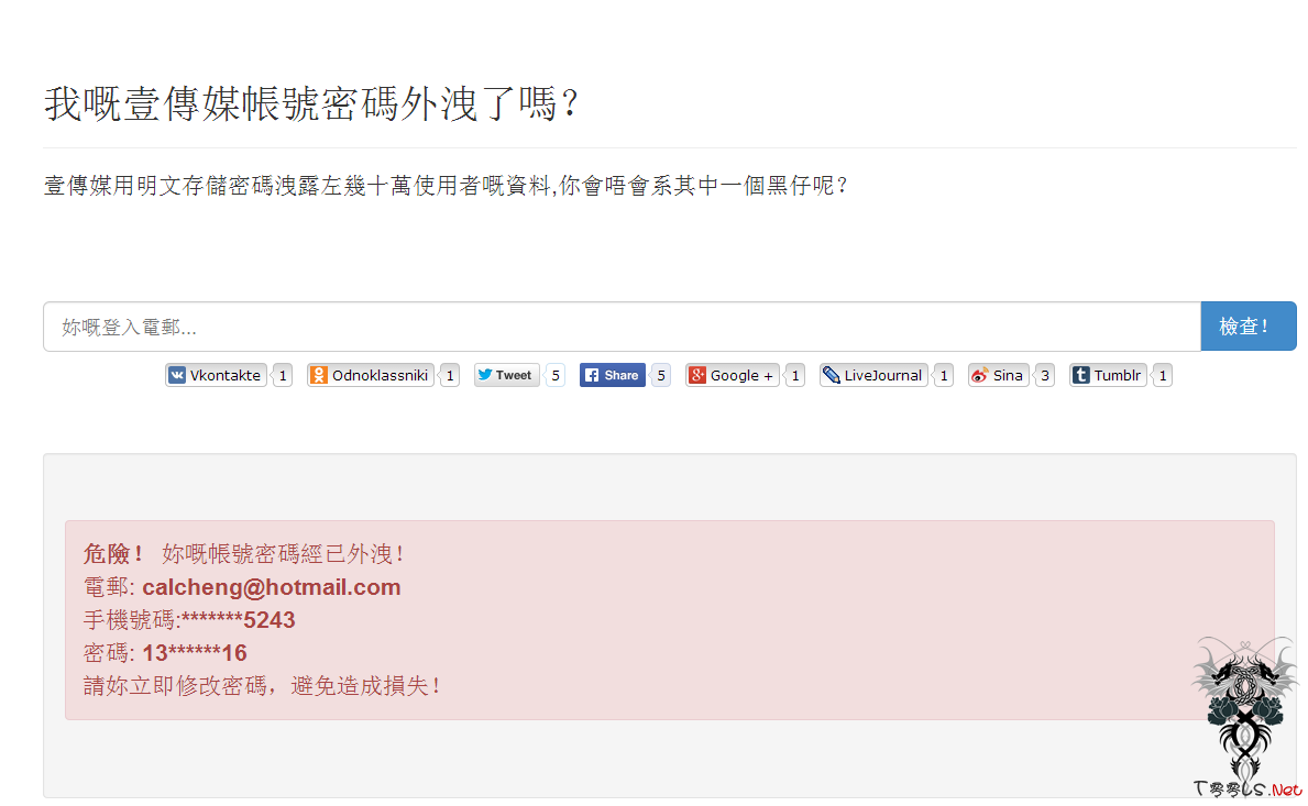 同前段时间炒得沸沸扬扬的gmail数据泄露相似,发布这些账号信息的注册用户也搭建了相关的数据查询网站。如有你有在壹传媒网站注册用户,想要查询你的账号是不是在泄露的名单里,可以登录该网站,输入自己的邮箱账号即可。为了保险起见,不管你是否在这个名单上,还是换掉你的密码吧。用户可以通过一个名为“Next Media Has Been Pwned ,Is your password leaked?”的https://www.pwnnextmedia.com网站查询自己的用户数据是否被窃。