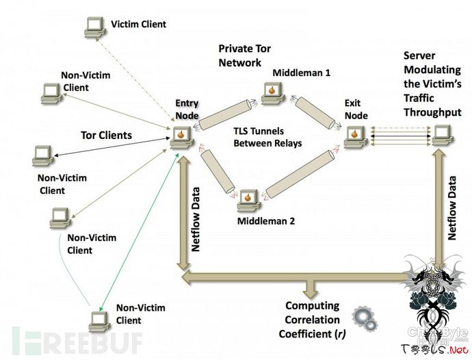 去匿名化的方法是向Tor出口节点相关联的TCP连接中个注入一个重复的流量模式(如HTML文件),然后把Tor客户端的出口流量和路由器上所产生的流量流动记录作对比,从而识别Tor用户的身份。