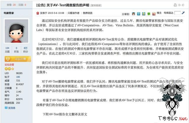 北京时间5月5日,我们遗憾地看到评测机构AV-Test发布公告,质疑腾讯电脑管家产品对该测试优化(optimizations)。但与此同时,我们也得到AV-Comparatives等知名评测机构的确认,由于使用了全面的性能测试方法,在他们的测试中腾讯电脑管家不存在问题,既有成绩不会受到任何影响,并将继续测试腾讯安全产品。在此之前的4月30日,三家机构曾联合发表调查声明,明确指出腾讯电脑管家产品并不存在问题。