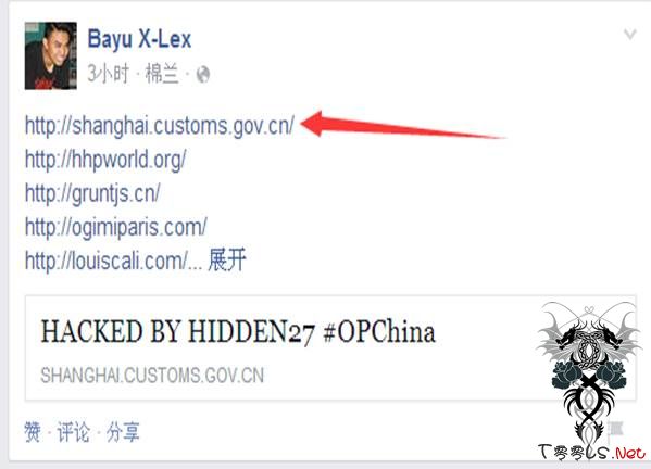 该组织建立了该次行动的Facebook专页,并对外喊话,让黑客们把**下来的网站留着,等到5月30日12点的时候,通过留言的方式在Facebook 专页上将**的网站黑页地址贴上去,以此来展示**成果,小编分析认为,这样做是为了给人一种一天**了很多网站的假象而引起众人的关注, 届时通过DDOS大规模攻击,让我国部分网络瘫痪,小编留意到,上海海曙官网已被涂鸦。