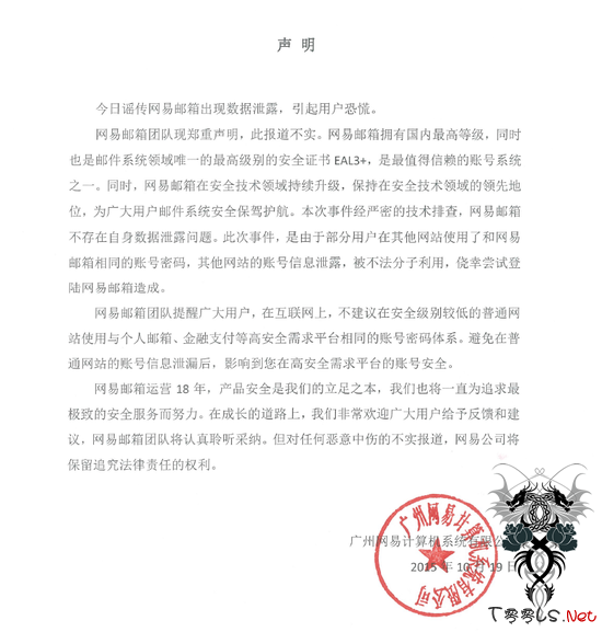 网易表示:“网易邮箱拥有国内最高等级,同时也是邮件系统领域唯一的最高级别的安全证书EAL3+,是最值得信赖的账号系统之一。同时,网易邮箱在安全技术领域持续升级,保持在安全技术领域的领先地位,为广大用户邮件系统安全保驾护航。本次事件经严密的技术排查,网易邮箱不存在自身数据泄露问题。此次事件,是由于部分用户在其他网站使用了和网易邮箱相同的账号密码,其他网站的账号信息泄露,被不法分子利用,侥幸尝试登录网易邮箱造成。”
