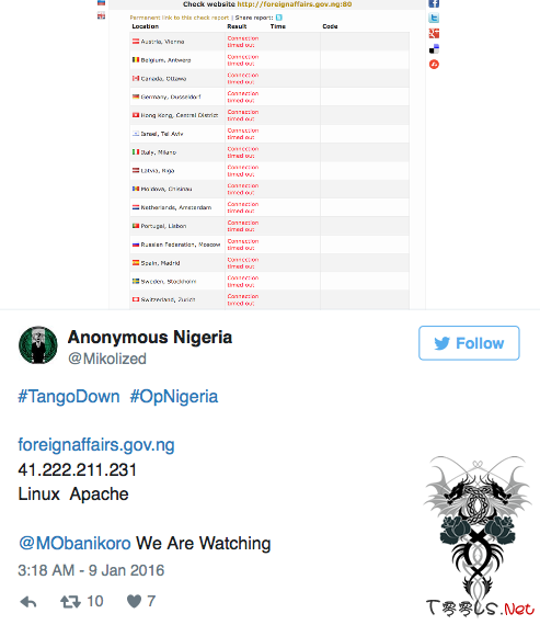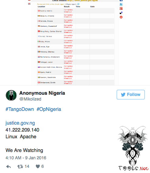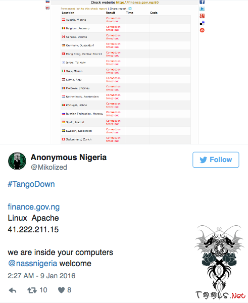 匿名者向尼日利亚政府发起网络战争 2016-01-11 10:07:45 0 r0ckFly 2233 匿名者向尼日利亚政府发起网络战争 据外媒报道,日前,黑客组织匿名者(Anonymous)开始向尼日利亚政府发起了网络战争。该组织在网络新闻发布会上称,尼日利亚政府腐败、贪婪,比起投资和提高人们的生活水平,它更专注于盗窃数十亿美元的金钱。据悉,在匿名者在由其控制的各个网站和Twitter账号上宣布了这一消息之后,尼日利亚已有多个政府网站遭到DDoS攻击。 没过多久,这些网站开始停摆,遭到攻击的网站包括了尼日利亚联邦首都区管理局、司法部、财政部、外交部、海关局、国家立法研究所。 由于现在网络攻击才刚刚开始 ,所以相信接下来将会有更多的尼日利亚政府网站受到影响。 类别 新闻资讯 关于作者 r0ckFly51篇文章745篇回复 低调,持续的学习技术