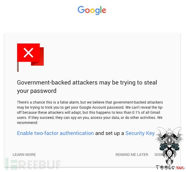 谷歌方面识别出这次攻击是由政府赞助黑客发动,受害者身份通常为:积极分子、新闻记者、政策制定者等,他们会向这些受害者发出正被黑客攻击的通知。