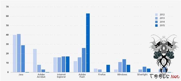 2012-2014年,Java的漏洞“利用率”一直都是最高的,2015年则是Flash第一次“夺魁”,Java则几乎销声匿迹,位列第二第三的分别是IE浏览器、Windows操作系统。