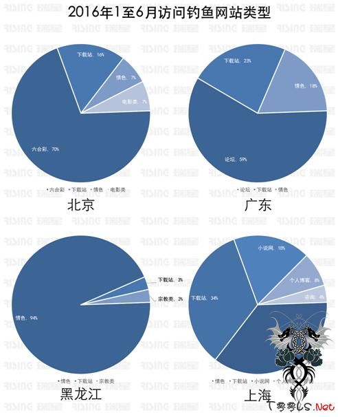 报告显示,北京、广西访问的钓鱼网站主要为赌博类,黑龙江、新疆、天津访问的钓鱼网站则是以色情类为主,江苏、上海、安徽访问的钓鱼网站更加多元化,包括色情类、下载站类以及赌博类。