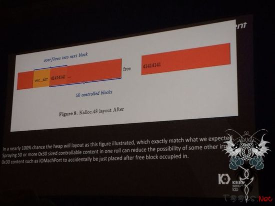 这个漏洞处于比较活跃喧嚣的内存区,利用时一旦内存收到干扰,就会失败。所以我们发明了一套“内存风水论”。利用内存分配某些“先进先出”的特性,构造了一些“空洞”,然后想办法让我们的代码正好落入这片“空洞”之中。