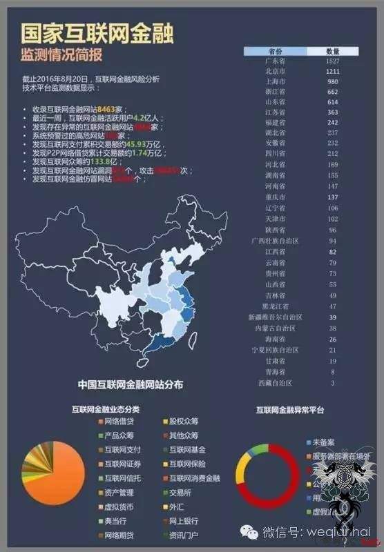 8月26日,据国家互联网金融风险分析技术平台监测数据显示:截至2016年8月20日,平台共收录互联网金融网站8463家,发现存在异常的互联网金融网站4064家,其中,广东省最多,有1527家,紧接着北京有1211家,上海有980家。另外发现互联网金融仿冒网站34493个。