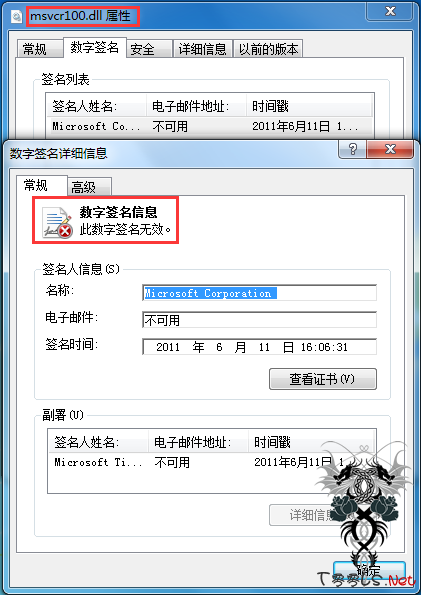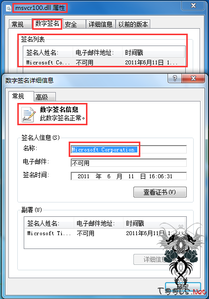 找一个带有数字签名的程序来实验,就以微软官方的库文件msvcr100.dll为例。右键点击文件属性,可以看到有一个数字签名的标签,依次点击可以查看到下面的签名有效状态,表示这个程序的数字签名验证成功,“程序数据没有被篡改”(这里加引号说明理解需要谨慎,详看下文)。