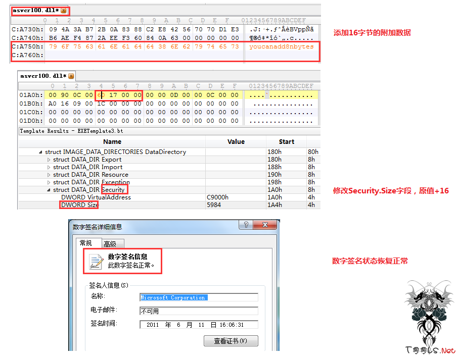 这就给我们造成一种感觉,数字签名真的可以保证数据不被篡改,只要数据受到篡改,就会被系统的验证机制检测到并提示签名无效。然而,这种感觉其实并不靠谱,因为我们实际上只是对签名文件添加了一些数据,并没有修改到程序的原始数据区域的部分,理论上只要系统能够找到程序的数字签名并通过上述的验证流程,那么数字签名就仍是有效的,受保护数据没有遭到篡改。那么,有没有办法让这个添加了数据的文件去正确识别数字签名并显示签名有效呢,答案是肯定的,而这也正是本文所指的“漏洞”。