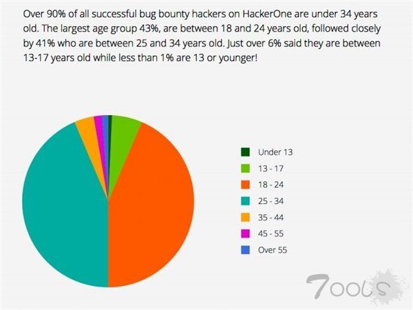 HackerOne调查的黑客中有90%年纪在35岁以下,其中18岁到24岁的年龄段人数最多,达43%,其次是25岁到34岁年龄段,为41%。只有6%的受调查黑客称自己年纪在13岁到17岁间,不到1%的受调查黑客年纪在13岁以下!