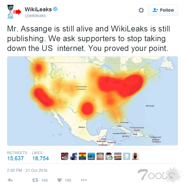 有人怀疑,此次大规模网络攻击可能与此有关。而且在攻击发生后,维基解密迅速在Twitter上又发表声明,声称目前阿桑奇还活着,同时呼吁支持者停止攻击美国的网络。