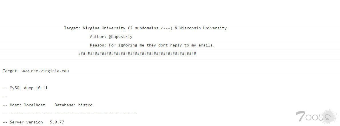 Kapustkiy最近再次行动,入侵了弗吉尼亚大学两个子域和威斯康星大学子域,以及印度驻纽约大使馆数据库。