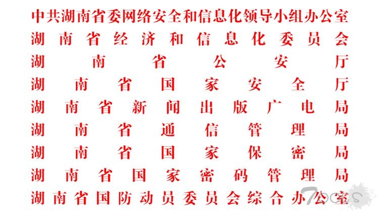 中共湖南省委网络安全和信息化领导小组办公室(湖南省互联网信息办公室)、湖南省经济和信息化委员会、湖南省公安厅、湖南省国家安全厅、湖南省新闻出版广电局、湖南省通信管理局、湖南省国家保密局、湖南省国家密码管理局、湖南省国防动员委员会综合办公室。