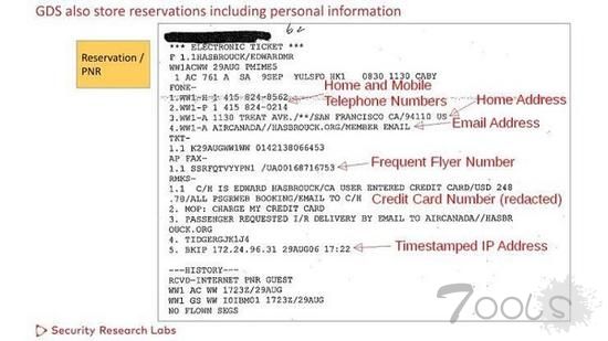 通过这一代码, 即可访问到完整的旅客信息:包括家庭和电子邮件地址、手机/信用卡号码、常旅客编号、以及当初在线预定该机票的 IP 地址等。