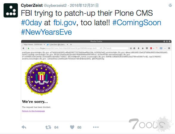 FBI 在得知了 CyberZeist 的入侵消息后,立即指派安全专家展开修复工作,但目前 Plone 内容管理系统的 0-day 漏洞仍未被修复,对此 CyberZeist 还发布过一条具有嘲讽性质的的推特。
