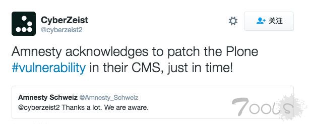 此后,CyberZeist 又发布了一条消息,表示国际特赦组织的网站也收到此漏洞的影响,该消息得到了对方的证实。