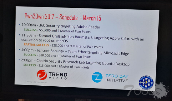 Pwn2Own2017比赛分为三天进行,首日比赛战罢,目前已有多支中国团队亮相。