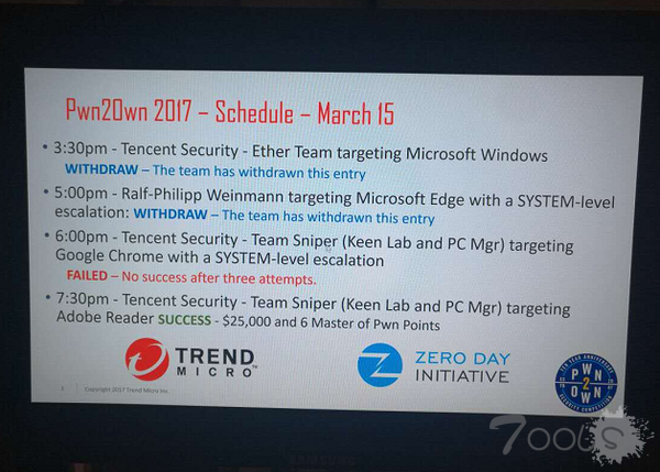 腾讯在Edge抽签上的好运并没有延续到Adobe项目上。根据比赛抽签顺位,腾讯Sniper团队排在后面出场,攻破Adobe Reader只能获得一半奖金,因此最终成绩是25000美元奖金和6个积分。