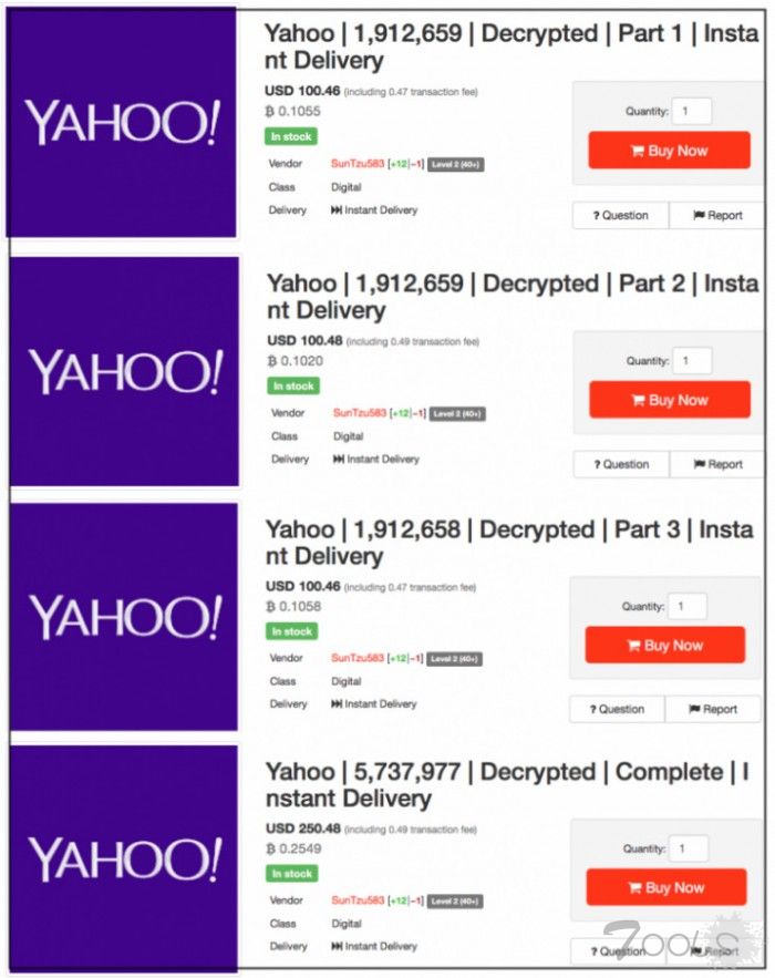 此次暗网上一共出售了5,741,802 个雅虎账号,同样分成了三份,每份包含1,912,659 个账户。三份数据的总价为250美元(0.2532个比特币)。