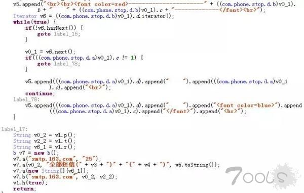 木马将盗取用户的短信、通讯录等通过SMTP协议发送到指定的邮箱。由于使用SMTP协议发送邮件,需要发件人的邮箱账号密码。所以样本中内置了牧马人的发件邮箱账号密码。