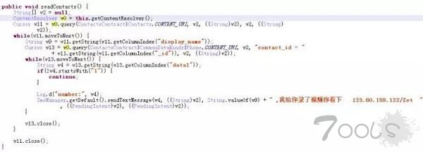样本安装运行后还会向用户的所有联系人发送短信进行恶意传播,内容为: 我给你录了视频你看下 123.60.159.122/Zet 。当联系人收到该短信访问此链接后又会下载该木马病毒。