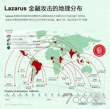 根据卡巴斯基实验室记录,从2015年12月开始,同Lazarus黑客组织活动相关的恶意软件样本出现在众多国家的金融机构、为投资公司开发赌场软件的开发商以及加密货币企业。其中包括韩国、孟加拉、印度、越南、印度尼西亚、哥斯达黎加、马来西亚、波兰、伊拉克、埃塞俄比亚、肯尼亚、尼日利亚、乌拉圭、加蓬、泰国和其它国家。卡巴斯基实验室发现的最新样本于2017年3月被检测到,表明攻击者根本没有停止攻击的打算。