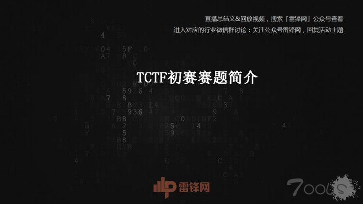 第二部分,谢天忆讲解腾讯 CTF (TCTF)初赛题目及解答,由于涉及到很多术语和代码,雷锋网编辑整理了谢天忆的PPT,请读者配合视频直接“服用”。