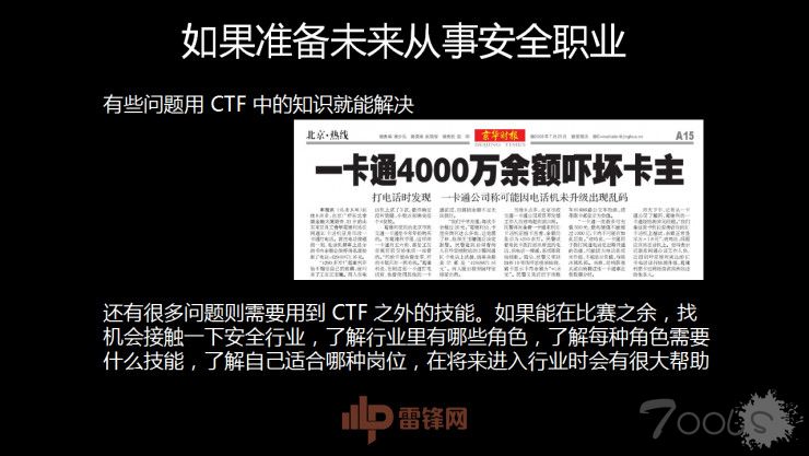 如果,你不但对安全感兴趣,而且想未来从事安全工作,那么就要明白,CTF中的技术对安全工作来说一部分,不是全部。工作中遇到的有些问题可以用 CTF中涉及的知识解决。还有很多问题则需要用到 CTF 之外的技能。