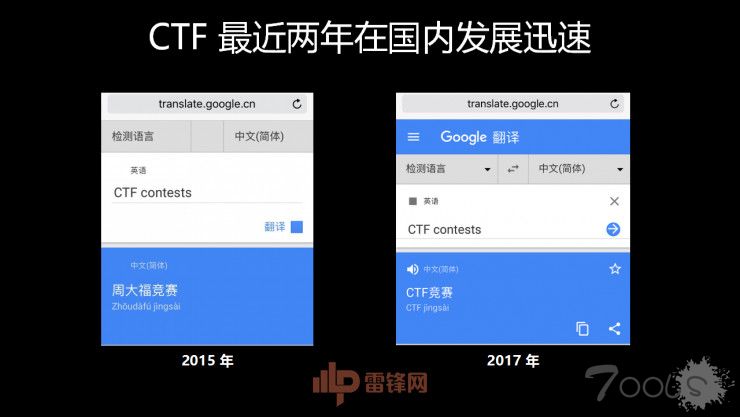 大家可以看到,2015年,在谷歌翻译上输入“CTFcontests”,翻译是“周大福竞赛”。但在2017年,谷歌翻译就已经认识 CTF了,我觉得这能说明一点问题。