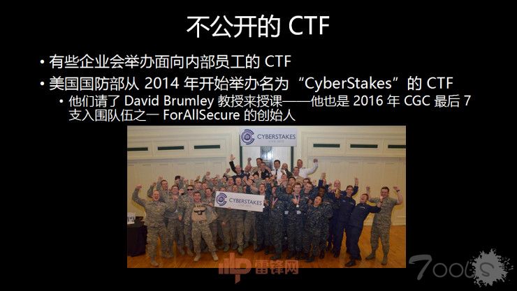 刚才提到的这些都是公开的CTF。还有一类是不公开的 CTF,不会公开征集报名,开展预赛之类。比如,有些国内、国外企业会举办面向内部员工的 CTF。另外,从公开信息可以了解到,美国国防部从 2014 年开始举办名为“CyberStakes”的 CTF 。美国国防部有一个网络安全人才的培养计划,目标是花3年时间在美国军队里培养 4000 名安全专家。而且标准很具体,要求会挖漏洞,会写Exploit。训练的一个环节就是CyberStakes”。而且他们邀请了 David Brumley 教授来授课。这位教授是 2016 年 CGC 最后 7 支入围队伍之一 ForAllSecure 的创始人。CGC 是 CTF 历史上的转折点,不再只是人和人打,而是和机器打。他们招募了一些队伍设计了一套系统,和人类战队打 CTF。就像阿法狗与人类下围棋一样。不过,CGC最后的战胜队还是人类队伍。虽然机器队伍没有横扫千军,但也不是最后一名,还是有两支人类队伍输给了机器。