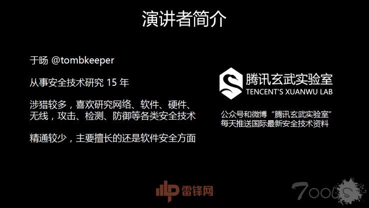 大家好!我叫于旸,从事安全技术研究工作已经有15年了。爱好比较广泛,接触过很多类安全技术。精通的较少,主要擅长的还是软件安全方面。我现在在腾讯负责玄武实验室的工作,如果你是一个安全爱好者,可以在搜索“腾讯玄武实验室”的微信公众号或微博账号,我们每天会推送国际上最新的安全技术信息。