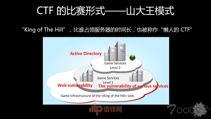 还有一种模式,这种模式在国内不常见,称为“King of The Hill”,我把它叫做“山大王”——大家同时攻击一个服务器,比谁占领服务器的时间长,保持自己的控制权,不被别人干掉。这其实和传统夺旗更像,守好自己抢夺的东西,也被人称作“懒人的 CTF”,因为占领方有很大优势,有时候可以打得比较悠闲。