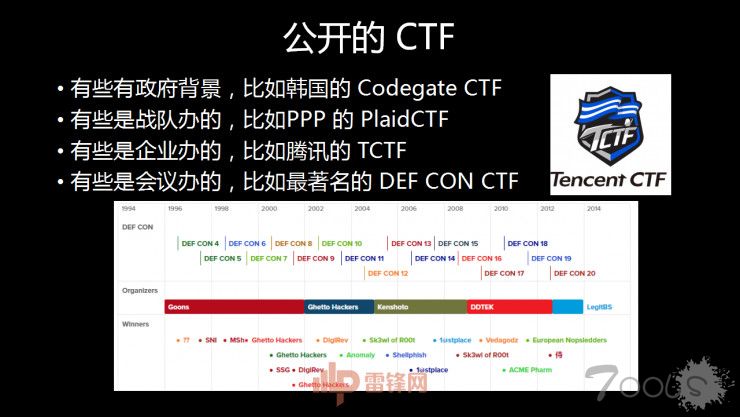 近几年,国际、国内的CTF种类越来越多。举办CTF的组织方各有目的,有些有政府背景,比如,韩国的 Codegate CTF;有些是战队办的,比如,PPP 的 PlaidCTF,这种比较常见;有些是企业办的,比如腾讯的 TCTF ;有些是安全会议牵头办的,比如著名的 DEF CON CTF,实际具体操办的也是战队。DEFCON CTF是目前还在办的历史最悠久的CTF。最早一届DEFCON CTF 是1996年办的。