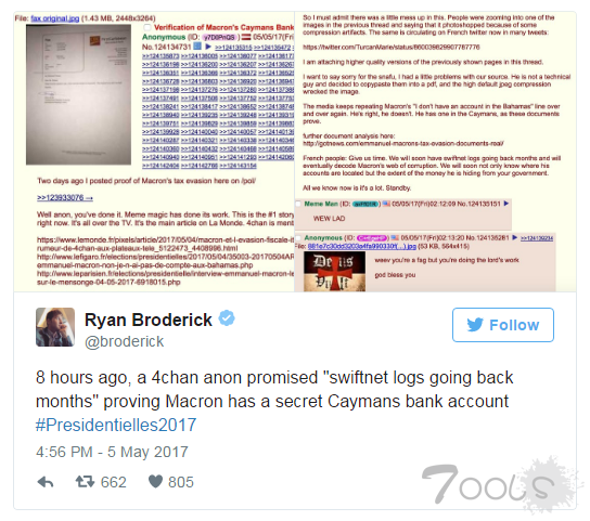 目前还没有个人或团体宣布对此事件负责。然而,周四有用户在4chan论坛受欢迎的/ pol /版块上承诺将提供关于Macron的数据。在这篇文章中,匿名用户声称具有证明Macron逃税的“swiftnet日志”,但这似乎并不包含在周五泄露的数据中。