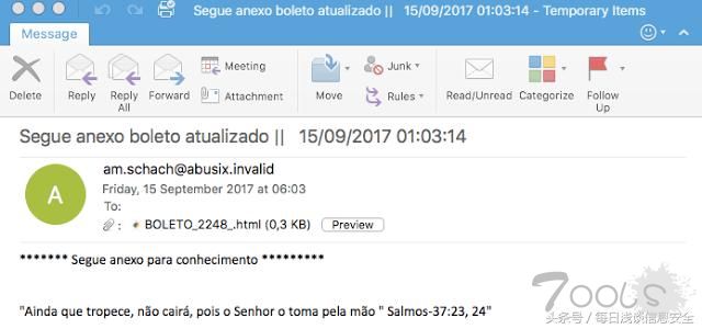 该邮件含有一个名为BOLETO_2248_.html的附件,BOLETO是巴西使用的一种发票。这个HTML文件含有一个简单的重定向: