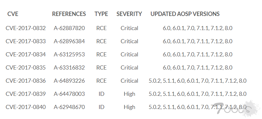 其中大部分的漏洞影响着 Media 框架,安全补丁程序解决了 7 个问题。