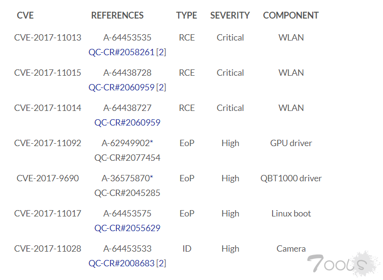 2017-11-05 安全补丁程序解决了 11 个安全漏洞,其中包括 3 个严重的 RCE 漏洞,7 个引起特权提升的高严重性漏洞和 1 个严重的信息泄露漏洞。其中,高通组件受到的影响最大,该安全补丁解决了 7 个问题,其中一个漏洞可能被远程攻击者利用在特权进程的上下文中执行任意代码。