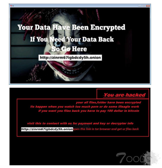 此外,勒索软件使用了硬编码的 AES-256 密钥加密文件,并将“(Lucifer)”字符串加到加密文件中。买家可以通过改变两个图像并添加定制的支付站点 URL 来完成安装,例如,一旦加密成功,image.png 就会变成(Lucifer)image.png。“任务完成”后 Halloware 勒索软件将会弹出窗口显示一个令人毛骨悚然的小丑与一条赎金消息引诱受害者重定向至另一暗网支付网站,并更改用户的桌面墙纸或进行其他恶意操作。