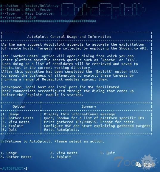 这段 Python 2.7 脚本名为AutoSploit,是昵称为“Vector”的用户于本周上传到GitHub上的,会在通过Shodan搜索引擎收集到目标后(需 API 密钥)尝试调用Metasploit模块攻击目标。