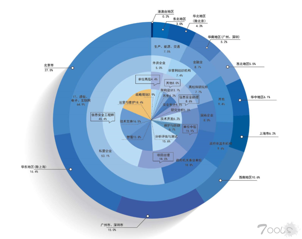 1.基本构成相对单一,地域分布以一线城市最为集中。我国信息安全从业人员以男性为主,多数为本科学历并具有计算机教育背景,与全球信息安全从业人员的构成基本一致。同发达国家相比,我国信息安全从业人员年龄构成相对年轻,从业年限整体上也相对较短。在地域分布上以北上广深四大一线城市最为集中,此外在最具经济活力、电子信息产业规模化发展的长三角地区,以及安全企业和信息安全强校汇集的西南地区也比较集中。