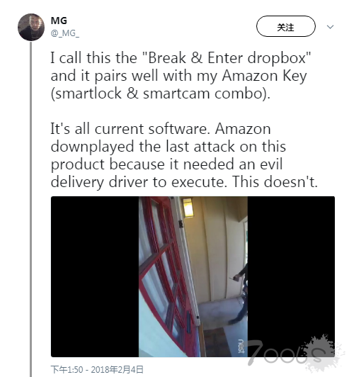 这个漏洞不仅暂停了视频画面,还使电子锁无法正常使用。然而,亚马逊低估了这个漏洞的严重性。现在,一个独立的安全“爱好者”通过Twitter账号MG揭示了一个攻击者(非送货员)可能如何利用该系统。他称物理硬件为“Break&Enter dropbox”,并用他自己的Amazon Key设置在视频中演示了攻击。
