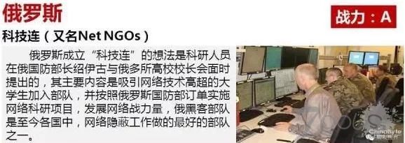 俄罗斯:俄罗斯在2013年开始建立网络司令部应对虚拟威胁,但直到近期,官方才确认这一消息。俄军总人数约1.2万人。俄罗斯通过成立"科技连"吸引网络技术高超的大学生加入部队,人员数量正在迅速扩充。
