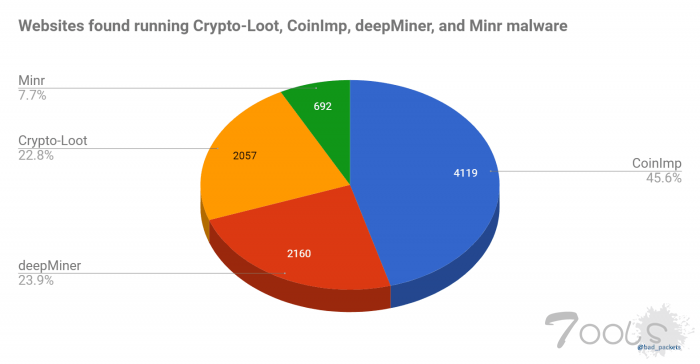 而其他19%网站大多感染了Coinhive的同类脚本,例如Crypto-Loot, CoinImp, Minr和deepMiner。根据进一步的调查,在本次扫描结果中有2057家网站感染了Crypto-Loot,有4119家网站感染了CoinImp, 有692家网站感染了Minr以及有2160家网站感染了deepMiner。